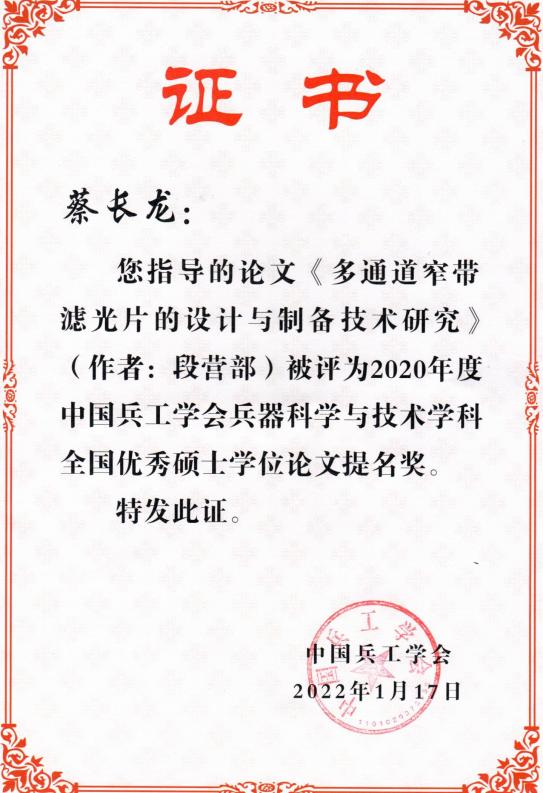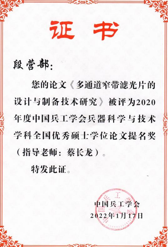 2022年1月17日,中国兵工学会公布了第五届兵器科学与技术学科全国优秀博士、硕士学位论文评选结果。本次评选共评出19篇优秀学位论文及提名奖,其中优秀博士学位论文4篇,优秀博士学位论文提名奖4篇,优秀硕士学位论文10篇,优秀硕士学位论文提名奖1篇。我校兵器科学与技术学科硕士生段营部的硕士学位论文“多通道窄带滤光片的设计与制备技术研究”荣获优秀硕士学位论文提名奖,这是我校首次获此殊荣。