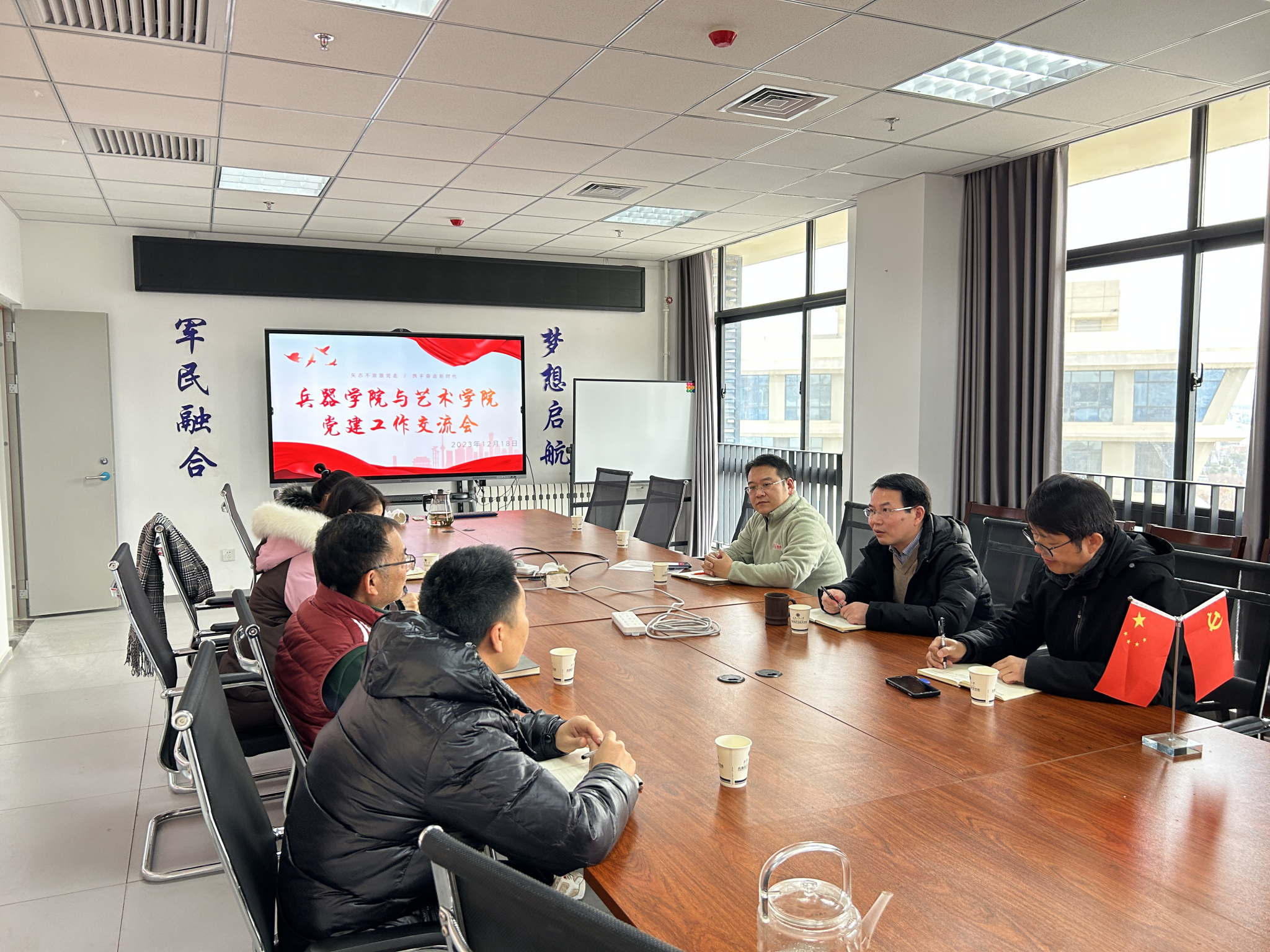 2023年12月18日下午2:30分,兵器科学与技术学院党委书记蔡长龙、党委组织委员陈丁、辅导员王国栋与来访的艺术与传媒学院党委书记周著一行四人与在兵器学院8-615会议开展两院党建工作交流。