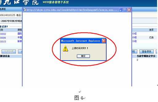 在你选中的课程名称前打上勾,单击右下方的【提交】按钮即可。选课成功后,会在下列表中加入你刚刚所选的课程;如果你原本就已经选过该时间段的课程,会出现时间冲突对话框(图4),请重新选择另外的时间段操作。