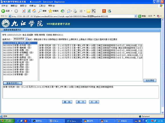 在左边列表中选择项目,右边列表中会出现此项目可选的时间段。根据自己的空余时间选定课程后,点击【选定课程】按钮,选定的课程会出现在下方的列表中(见图1.6.3),确定无误后点击下方【提交】按钮即可。