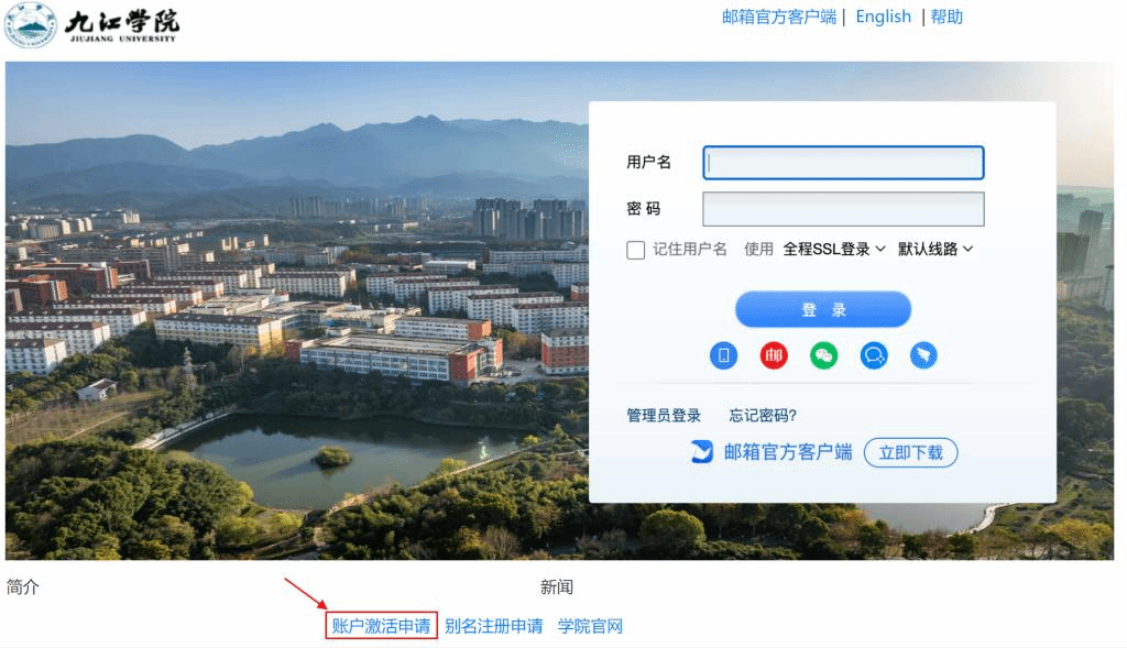 1. 原邮件系统用户名为工号/学号的账户,首次登录需要通过工号/学号验证身份激活后使用。激活方式:打开http://mail. jju.edu.cn/页面后,点击下方的“账户激活申请”进行账户激活。(激活网址http://10.13.7.62/)