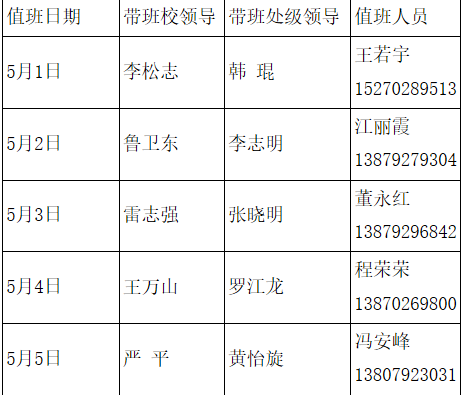 4.请有关部门和人员按要求做好“五一”劳动节放假期间行政楼值班工作(值班安排表附后)。