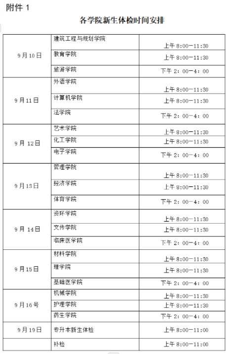 二、各二级学院、各班级要积极宣传、认真组织,根据《各学院新生体检时间安排》所有新生(本校专升本已体检学生除外)按体检规定的时间、顺序和要求完成体检。