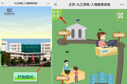 关注“九江学院图书馆”微信公众号(账号“jjxy_tsg”),点击右下角“读者服务——入馆教育”进入游戏闯关页面。