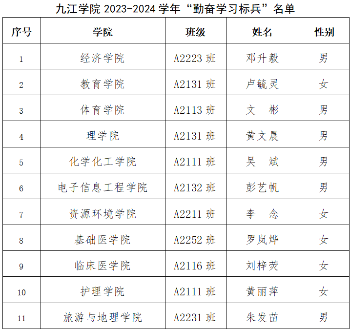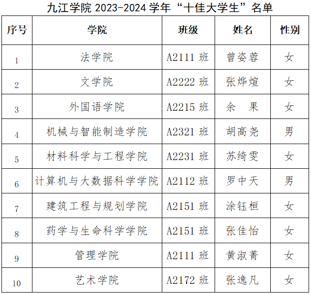 根据九江学院“十佳大学生”、“勤奋学习标兵”评选标准,经二级学院审核、推荐,学校“十佳大学生”“勤奋学习标兵”评审委员会评选,拟授予以下21名同学2023-2024学年“十佳大学生”“勤奋学习标兵”称号,现予以公示: