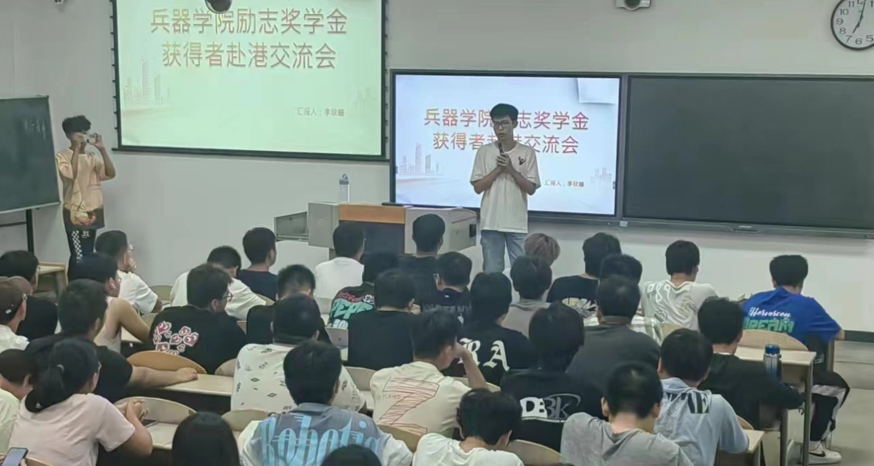 9月15日晚7点,兵器科学与技术学院在教2-103组织开展了“国家励志奖学金获得者赴港学习分享会”。2022级所有本科生参与,2021级探测制导与控制技术专业李欣岫同学主持分享。