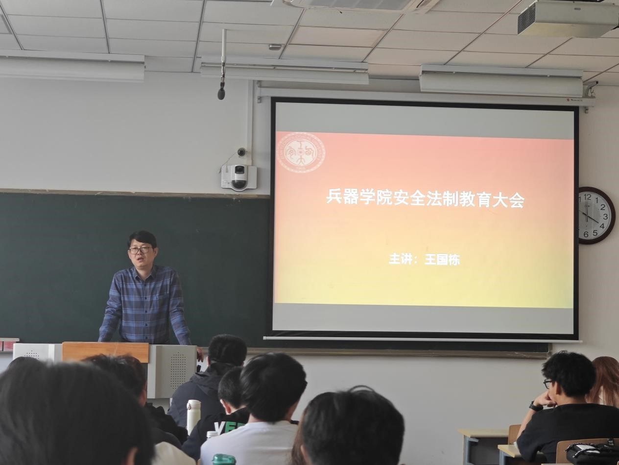 2024年4月2日星期二下午四点,为迎接即将到来的清明节假期、加强学生的安全法制意识,兵器科学与技术学院辅导员王国栋老师在教三212教室开展了“兵器学院安全法制教育大会”主题安全教育。