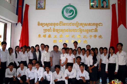 1月15日,柬埔寨王家研究院孔子学院暹粒联邦国际学院教学点举行揭牌仪式。暹粒省副省长文塔烈(Bun Tharith)阁下、王家研究院孔子学院院长谢莫尼勒(Chea Munyrith)阁下、柬埔寨江西商会会长谢运生先生、吴哥高中孔子课堂负责人、联邦国际学院负责人等暹粒省各界贵宾和百余名学生及家长参加了仪式。