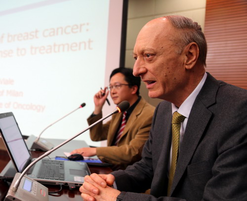 合作协议签约仪式结束后,随后举行了学术讲座。意大利米兰大学病理科主任Giuseppe Viale教授作了题为“肿瘤病理学研究新进展”学术报告;香港大学周永昌教授作了“乳腺肿瘤诊疗新进展”的学术学术报告。