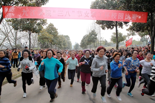 为跑出好成绩,女教工们发扬敢于拼搏,勇夺第一,不怕苦,不怕累的拼搏精神,你争我赶。在环校跑队伍中,有一支特别的队伍,她们是离退休女教工,她们精神焕发,健步如飞,风采不减当年,成为一道亮丽的风景线。比赛过程中,年长的女教职工和许多女青年教师一起,满怀信心地向目的地跑去。大家自始至终精神抖擞,朝气蓬勃,充分展现了九江学院人奋发向上、团结一致的精神。虽然气温较高,但是广大女教职工们在这个属于自己的节日里,参与活动的热情丝毫不减,她们一路欢声笑语,一直坚持到了环跑线路的终点。