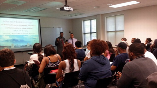 甘校长在讲座后还向萨凡纳州立大学的师生们介绍了九江学院的概况,专业特色等,对萨凡纳州立大学的师生们去九江学院访问和学习表示欢迎。在场师生看到九江学院美丽的人文景色,了解到学校开设的特色项目,纷纷表示希望能去九江学院深造就读。