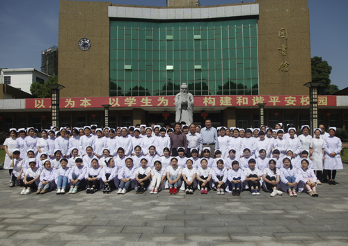 甘筱青热情邀请师生们合影,并介绍说,之所以把合影地点选在孔子雕像前,就是希望护理学院的师生们既要继承南丁格尔救死扶伤的人道主义精神,更要弘扬孔子仁爱天下的儒家思想。