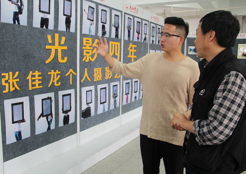 张佳龙,甘肃陇南人,艺术学院A1143班学生,中共预备党员。在校学习期间,多次获“国家奖学金”、“国家励志奖学金”、“三好学生”、“优秀学生干部”等荣誉称号;现为中国高等教育学会摄影专业委员会会员、江西省摄影家协会会员、九江市摄影家协会会员,曾担任艺术学院第一届星河联合会庐岳摄影社社长、第二届星河联合会理事长等。其摄影、设计作品曾在多次国家级和省级、市级等大赛中参展并获奖。本次展览共展出其大学四年来积累的以“校园风光”、 “九院人文”、“社会纪实”、“艺术创作”为主题的摄影作品99组、共计150余幅。