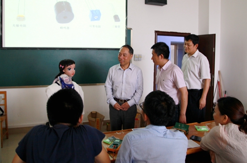 6月7日上午,甘筱青校长来到厚德楼514教室——我校信息学院智能机器人工作室开办的机器人创新空间,听取了张广顺老师在每周日面向校内外人员开放的实践教学课。教务处处长马明亮、信息学院院长邓安远一同听课。