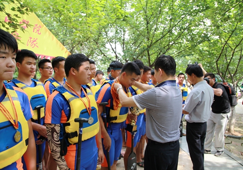 表演赛前,还进行了表彰活动,甘筱青、陶春元以及相关部门负责人,为校龙舟队颁发他们在亚洲大学生龙舟锦标赛获得的奖杯、奖牌。并与他们合影留念。