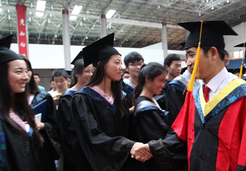接着,在庄严神圣的气氛中,举行了隆重的学位授予仪式。伴随着欢快的音乐,身着鲜红导师服的全体校领导健步走到列队等候的毕业生队伍前,亲手为48名身着学士学位服的学生代表一一正冠拨苏,并与他们握手和合影留念。庄严的学士服与张张青春朝气的笑脸交相辉映,豪情壮志激荡在每位毕业学子的心中。阳光自信的九江学院学子,身着端庄稳重的学士服,整装待发。鞠躬、握手、拥抱,他们用最真诚的方式来感谢母校、感谢师长,他们用最动人的微笑为大学四年的学习历程划上了圆满的句点。
