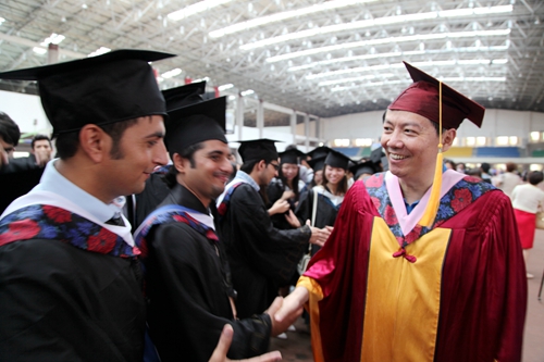 各二级学院领导和机关各部门负责人也分别走入毕业生队伍中,为全体毕业生扶正学位帽,拨转流苏。毕业生满怀激动,逐一快步趋前,向导师深深地鞠躬。整个会场气氛热烈、喜气洋洋,难忘的时刻凝聚在每个同学的笑脸上。