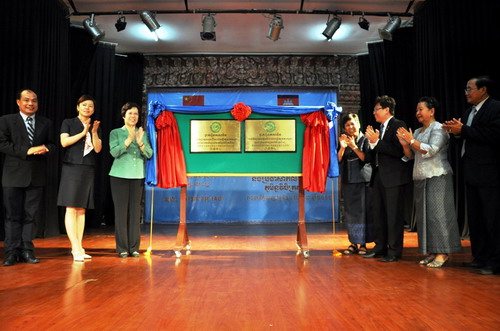 7月14日,柬埔寨王家研究院孔子学院文化与艺术部汉语中心、王家艺术大学汉语中心揭牌仪式同时在柬埔寨文化与艺术部礼堂进行。中华人民共和国驻柬埔寨特命全权大使布建国阁下、柬埔寨文化和艺术部部长彭萨格娜阁下(H.E. Pheung Sakuna)、孔子学院院长谢莫尼勒(H.E. Chea Munyrith)阁下、中方院长帅式毅及中国大使馆官员、文化部官员和孔子学院的汉语教师们出席本次揭牌活动。