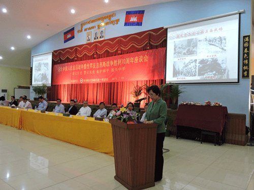 座谈会现场挂着“弘扬抗战精神,建设和谐侨社”、“促进中柬友谊、迈向美好未来”的大字幅,体现此次活动的意义。布建国大使在座谈会上发表讲话,回顾了给人类带来空前浩劫的第二次世界大战及中国人民抗战历史,强调以史为鉴,维护来之不易的和平局面,避免历史悲剧重演。