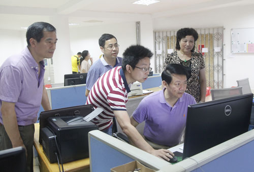 在远程网录取现场,郑翔书记听取了招生与就业处肖国丰处长关于招生情况的汇报,了解了目前的工作进程,并饶有兴致地观看了工作人员的实际操作。截至目前,除山西、云南、福建三省的本科录取尚在进行之中外,我校在其他省份的本科录取工作已基本结束,下一步将进行专科的录取工作。