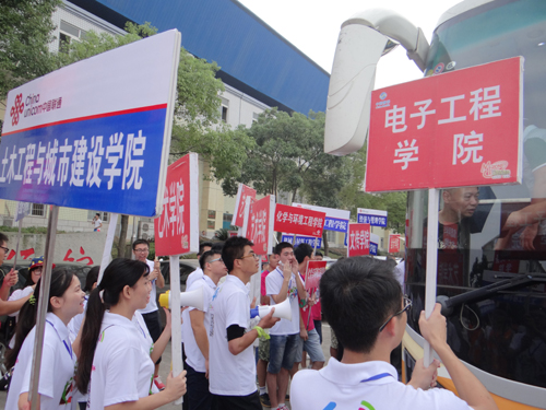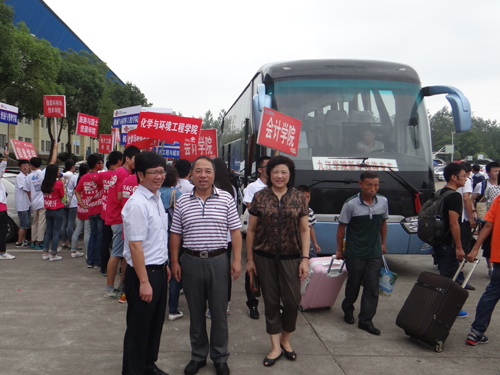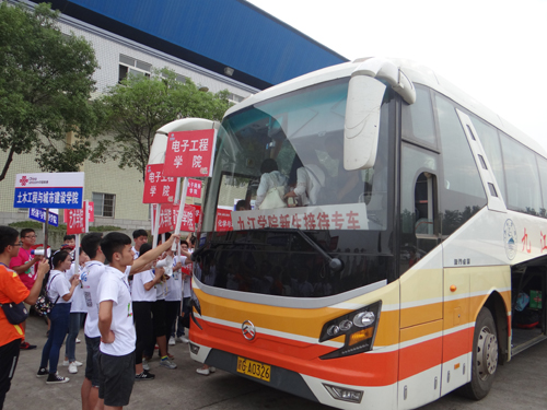 为方便提前来校的新生报到,学校的迎新工作9月3日下午就已经开始。9月4日清晨迎新工作全面展开。5点30分,学校13辆迎新校车分赴九江火车站、庐山火车站和九江长途汽车站,迎接新同学和家长到各自校区报到。当校车驶入报到现场时,早已等候在这里的迎新工作人员和志愿者高举着各个学院的引导牌在车门处热情地招呼着自己学院的学弟、学妹,带领他们到学院接待点存放行李、办理各项报到手续。