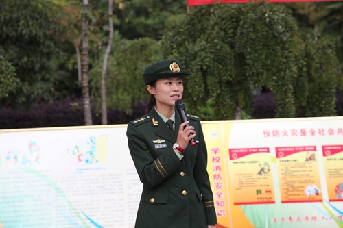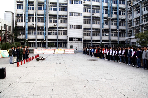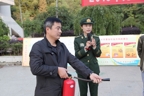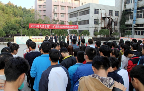 在第二十五个“119”消防宣传日的到来之际,11月4日下午,我校2015年119消防宣传月启动仪式在向学广场举行。校纪委书记魏立平、庐山区消防大队参谋邓雨欣,校保卫处、学生处、文传学院、理学院、会计学院、化环学院等部门负责人及学生代表约400余人参加了此次消防宣传及运用消防器材进行灭火的演练活动。