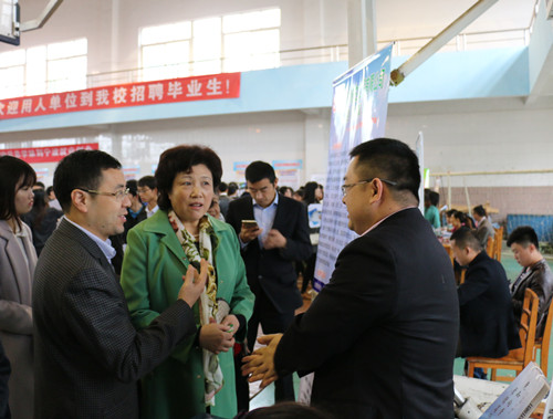 副校长吴桃娥来到招聘会现场,了解招聘会相关情况,走进每一家校友企业的展台,与来校招聘的校友深入交流,和前来应聘的应届毕业生亲切交谈,鼓励同学们大胆应聘,努力实现自身价值。