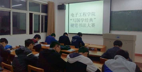 为提高工科学生的人文内涵,提升学生的综合素质,催化学生文化品位的提高,使国学素养成为学生教养的一部分,11月20日晚,电子工程学院举行“写国学经典”硬笔书法大赛,本次比赛全院学生积极参加,在班级选拔赛阶段共收到300余份作品,从中选拔出50名同学参加当晚现场赛。