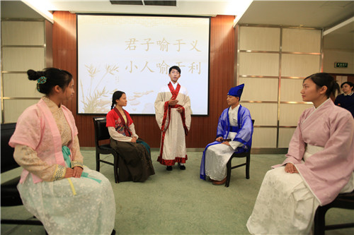 随后,郑州大学历史学院学生张晶、九江学院文传学院学生王玥分别代表参加此次文化交流活动的同学发言。开幕式现场,郑州大学学生人文演绎了古装情景剧《义利正道梦》、九江学院程欢、严跃新等人文演绎了古装情景剧《陆九渊朱熹白鹿洞会讲》。