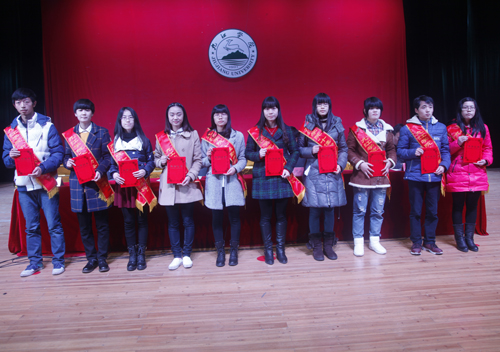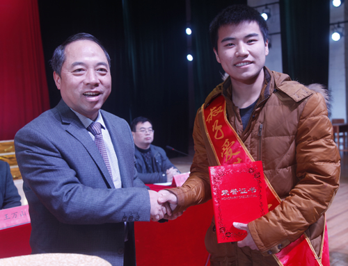 在热烈的掌声中,甘筱青校长为叔子爱莲奖学金获得者颁奖。随后,“十佳勤奋学习标兵”和“十佳大学生”依次走上讲台,与会领导分别为他们颁奖。