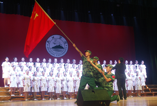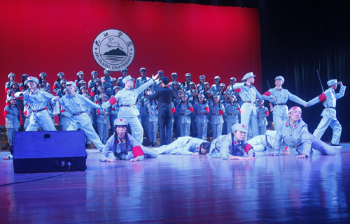 12月9日晚,我校大礼堂歌声嘹亮,座无虚席,以“同抒九院情,共筑中国梦”为主题的纪念“一二·九”运动80周年合唱比赛暨国学经典诵读表演在这里隆重上演。来自全校十余个学院的代表队在这里以歌唱、诵读的形式铭记历史,品味经典。校领导郑翔、纪岗昌、王万山、魏立平、杨耀防与千余名师生代表共同观看了演出。