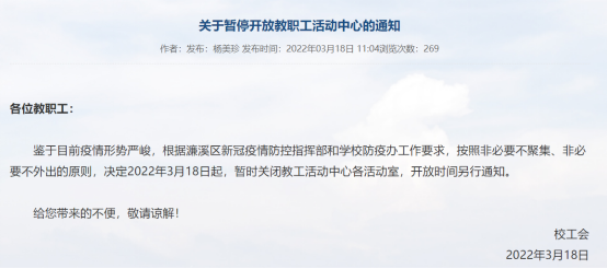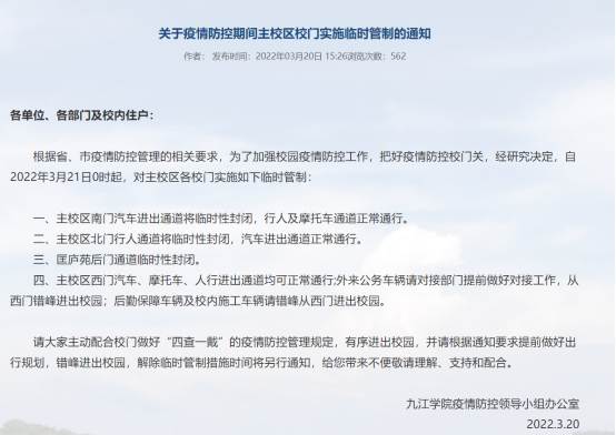 为做好防疫宣传工作,普及防疫科学知识,提升防控意识,让学院师生们以更加积极的心态应对疫情,校疫情防控领导小组办公室、学生处、校工会等部门分别发布了《关于疫情防控期间主校区校门实施临时管制的通知》、《致全体九江学院学子的疫情防控倡议书》、《关于暂停开放教职工活动中心的通知》等。