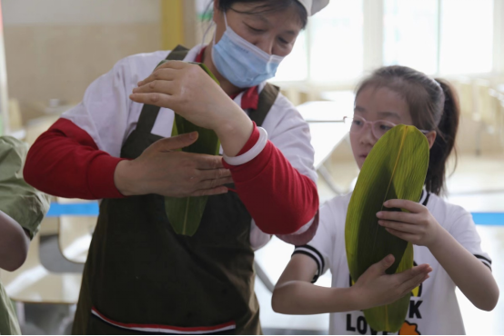 食堂阿姨更是“手把手”的传授如何包粽子,“粽子一定要包得紧实,做出来的才好吃。”食堂阿姨一边包一边叮嘱同学们。大家先将粽叶卷成漏斗状后,用筷子将馅料充实压紧,再用细绳一绕、一捆,一个个满怀情义的粽子很快就出现在面前。虽然大部分同学是第一次动手包粽子,包出来的粽子形态各异,并不“完美”,但现场其乐融融,充满着欢声笑语。