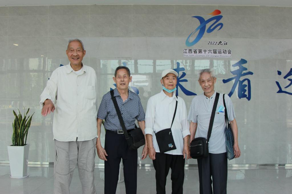 两名(右二、右一)90余岁的老同志参观省运会运动员村