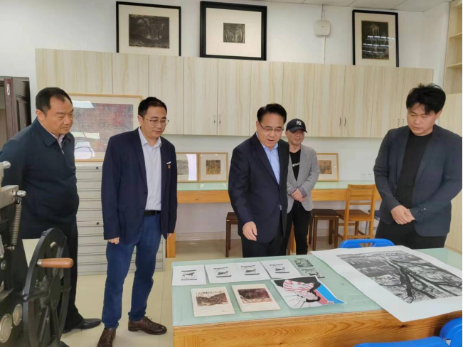 在艺术学院调研座谈前,李明斌观看了大型原创舞蹈《大湖之灵》的排练,听取了进展情况汇报,参观了艺术学院舞蹈教研室的“荣誉墙”、艺术学院版画工作室、文创设计工作室,以及青年艺术家吕雅明工作室。