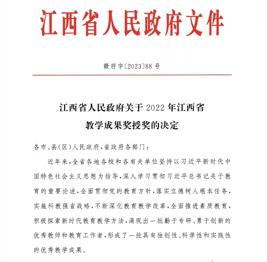 2023年12月29日,江西省人民政府《关于2022年江西省教学成果奖授奖的决定》(赣府字〔2023〕88号)发布,我校共有5项教学成果获奖。其中,以第一完成单位获得高等教育类(本科层次)一等奖2项、二等奖1项,基础教育类一等奖1项;以第二完成单位获得研究生教育类二等奖1项。