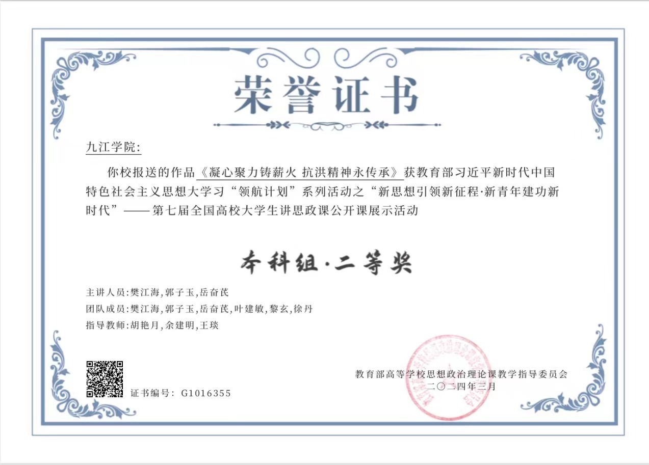 近日,由教育部高校思想政治理论课教学指导委员会主办,南开大学马克思主义学院承办的“新思想引领新征程·新青年建功新时代”——第七届全国高校大学生讲思政课公开课展示活动评审结果公布,由我校教师胡艳月、王琰和余建明指导,由九江学院临床医学院学生樊江海、郭子玉、岳奋芪、黎玄、叶建敏、徐丹创作的公开课《凝心聚力铸薪火 抗洪精神永传承》荣获本科组二等奖,为我校再添全国奖!