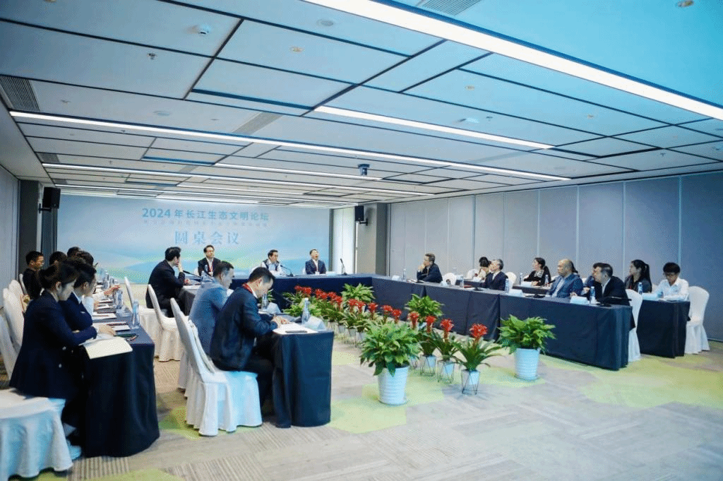 圆桌会议环节,中国工程院院士任南琪教授、中国工程院院士马军教授,九江学院党委书记李明斌教授,江西省生态环境监测中心副主任储险峰,九江市生态环境局党委书记、局长张南,中国科学院南京地理与湖泊研究所徐力刚研究员,江苏长江经济带研究院院长成长春教授,南昌大学刘耀彬教授,江西省林业局二级巡视员郭英荣、中国石化九江分公司唐安中教授级高工分别就长江经济带高质量发展、绿色发展、生态文明教育等主题作交流发言。