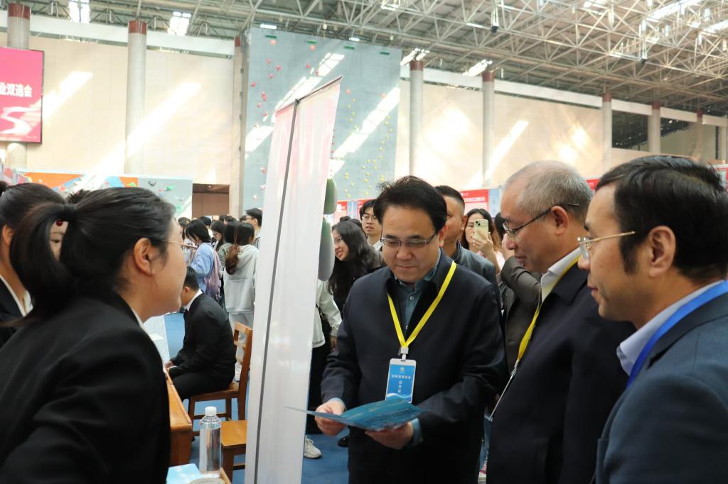 在招聘会现场,李明斌、陈小林走访了各个展台,与用人单位负责人亲切交流,详细了解招聘动态及岗位需求,听取对学校人才培养、实习实践、校企合作、产教融合和就业服务等方面的建议。