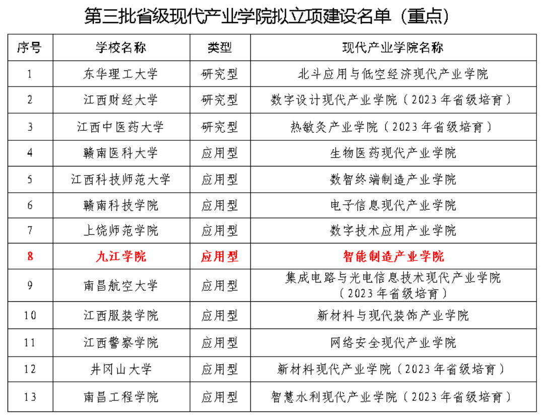 近日,江西省教育厅公布了第三批省级重点现代产业学院名单。全省13个现代产业学院获批第三批省级重点现代产业学院,我校智能制造产业学院成功入围。