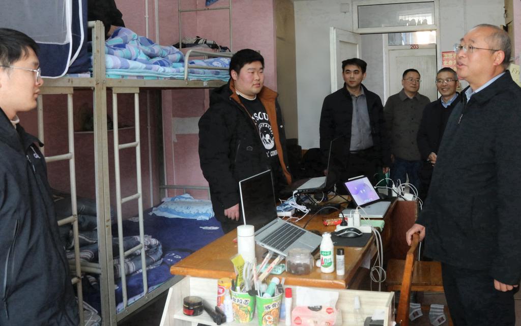 校领导先后来到学生党员活动室、宿舍自习室、学生工作办公室和学生宿舍,与辅导员和学生们亲切交流,详细了解同学们在寒假期间的生活、学习情况及新学期的学习规划。他们还深入了解了一线学生工作者的日常工作,了解宿舍管理、思想政治教育等方面的情况。