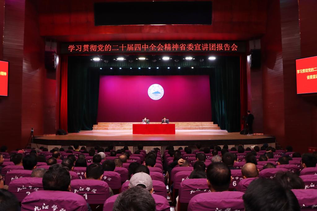 按照省委统一安排,11月11日,学习贯彻党的二十届四中全会精神省委宣讲团报告会在九江学院大礼堂举行。省委宣讲团成员、省委宣传部副部长,省文化和旅游厅党组书记、厅长梅亦作宣讲报告。在校校领导、全校副处级以上干部、民主党派负责人、思想政治理论课教师、学生代表等600余人在主会场参加了报告会,全校各单位师生1000余人通过在线直播参会。报告会由九江学院党委委员、副校长查振华主持。