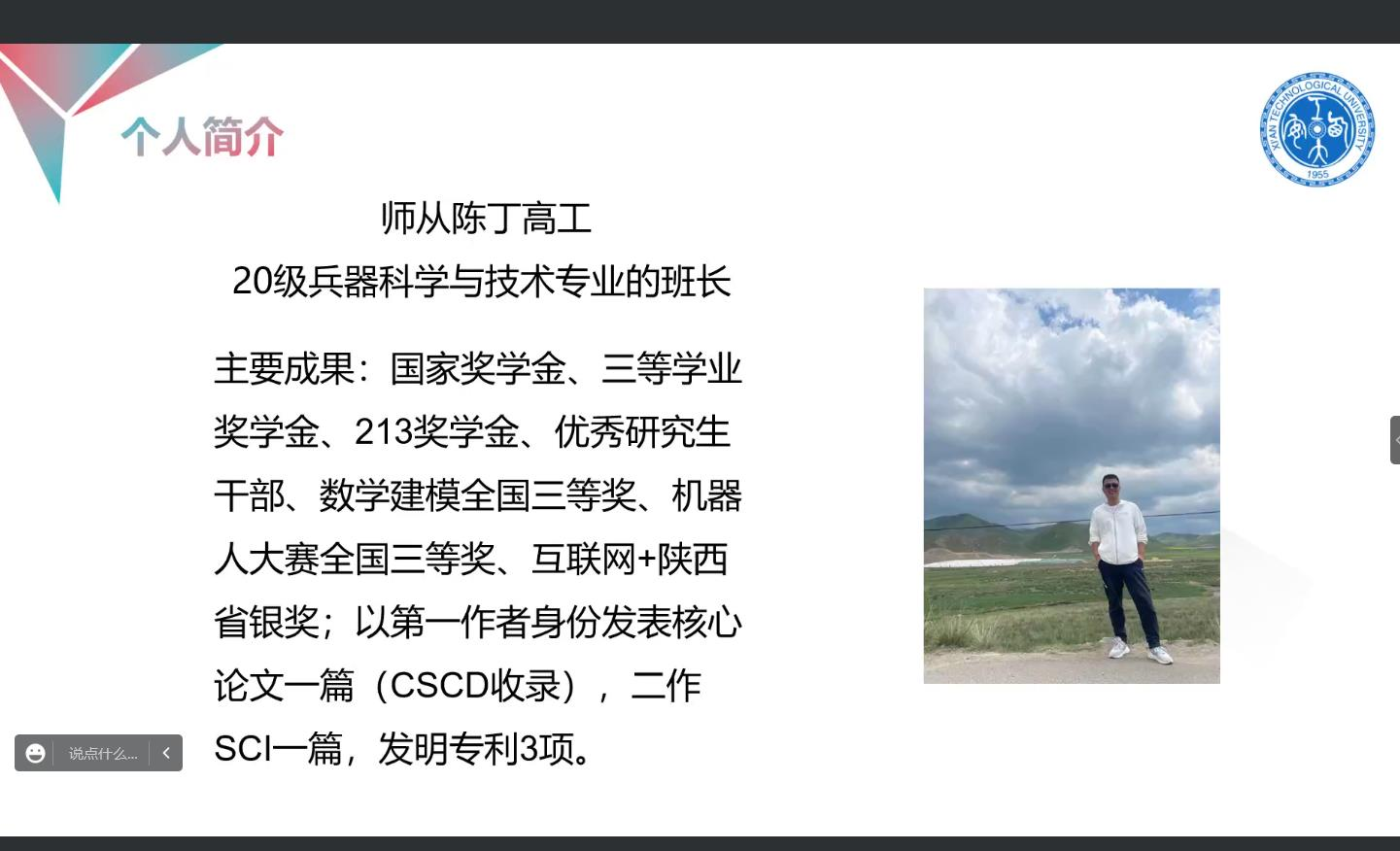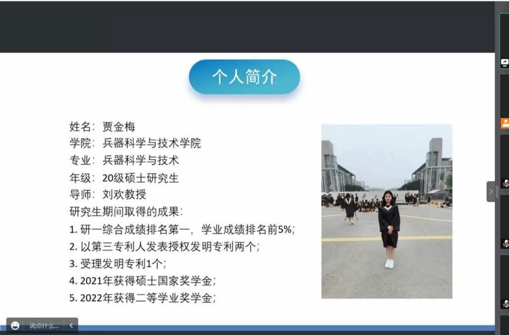 为帮助新生规划学业,解答新生在学习上的疑惑,兵器科学与技术学院于2022年9月23日19:00在线上举办了“国家奖学金”获得者交流报告会,参会人员有研究生辅导员王国栋、2022级全体研究生、国家奖学金获得者贾金梅、牧迪和雷晓明。