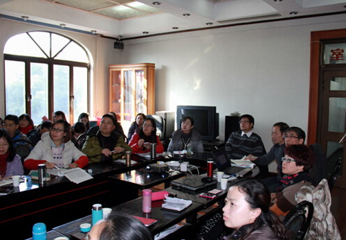 上海外国语大学博导、上海外语音像出版社社长陈坚林教授和他的博士团队为这次交流活动做了精心安排。 在整个下午的研讨会上,杨节之教授首先就整合网络资源的英语视听说教学模式进行了汇报,展示了重点学科项目“英语视听说”网络平台。杨节之教授的报告和研究成果受到陈坚林教授的博士团队的高度评价。 同时,博士们也对这种创新教学模式提出了各自的观点和疑问,并从不同角度提出了建设性建议。杨节之教授和我校外国语学院教师对博士们提出的各种疑问进行了解答。随后,韩琨院长就九江学院外国语学院的实施翻转课堂的情况进行了汇报,对我校的高层次人才引进工作做了介绍,欢迎有求职意向的上外博士到九江学院考察。最后,陈坚林教授对这次交流内容做了精彩点评。双方就今年4月份在九江学院举办外语教学研讨会,就外院高层次人才引进事项进行了洽谈,并达成初步共识。