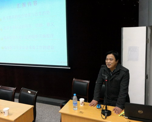 九江学院医学部副部长向维聂教授从医学教育的现状、临床医学专业认证的必要性及意义、临床医学专业认证的具体流程及认证的计划、目前我校临床医学专业认证亟待解决的问题等方面进行专题讲解,并结合各科室及教师需要进行准备的材料进行专题辅导。基础医学院教务科、学生科、实验中心、人体解剖学教研室和生化教研室代表进行表态性发言,表示要主动配合,凝练特色和亮点,做好专业认证工作。