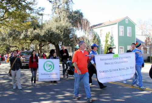 1月19日,萨凡纳州立大学孔子学院的老师和萨凡纳州立大学的师生代表队一起,和当地民众相聚在萨凡纳市中心参加马丁路德金日庆祝活动,共同纪念这位伟人。这是萨凡纳州立大学孔子学院第一次利用法定纪念日向萨凡纳市民推广和介绍孔子学院。