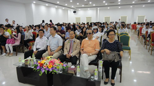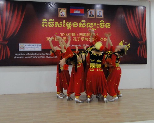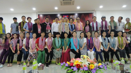 柬埔寨中华文化发展基金会秘书长黄瑞华、中国国务院侨办政法司司长董传杰、柬埔寨王家研究院孔子学院谢莫尼勒(Chea Munyrith)院长,中方院长帅式毅、亚欧大学校长谢索帕(Chea Sopheab)博士及近三百位师生代表齐聚一堂。艺术团团长董传杰介绍了艺术团主要成员,包括中国著名歌唱家杨洪基(《三国演义》主题曲演唱者)、布仁巴雅尔(《吉祥三宝》演唱者)、郭蓉(《红旗飘飘》演唱者)以及来自云南红河州歌舞团的艺术家们。