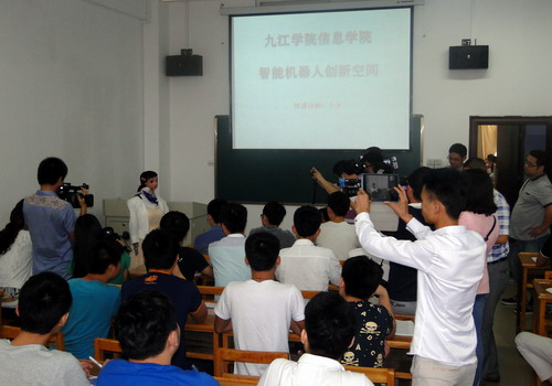 会上,党委宣传部副部长何桂林向省市媒体记者介绍了九江学院创新创业教育情况;信息学院院长邓安远介绍了信息学院对机器人上课研发进行指导、服务工作的相关情况。美女机器人讲课研发的主创人、信息学院张广顺老师介绍了美女机器人讲课创新开发的创意形成、效果展示以及前景预测等相关说明。美女机器人讲课研发团队学生成员周远明同学介绍了自己参与机器人研发过程的经历、感受和收获。