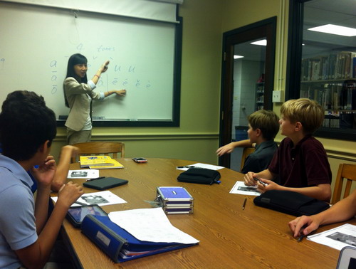 在第一堂汉语课上,孔子学院汉语教师张春子简单介绍了下汉字和汉字拼音的形成,并用手势语解释了汉语拼音的四个声调的发音方法,学生们很快就掌握了发音规则,并对汉语拼音的发音产生了极大的兴趣。课程结束后,学生们意犹未尽,纷纷要求老师给他们取中文名字,旁听的教导主任Lazzuri女士说到,汉语很有意思,感谢孔子学院的汉语课加入到St. Andrew中学的第二外语团队中。