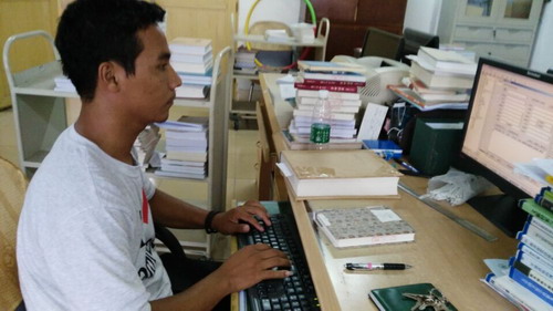 Keath Piseth是柬埔寨暹粒省青少年文化交流访问团中的一员,在柬埔寨孔子学院做志愿者,协助柬埔寨孔子学院图书馆中文图书的文献编目加工工作。他此行来九江学院图书馆的目的是交流学习中文图书的计算机编目技术和系统数据安全等管理技术。学校非常重视柬埔寨孔子学院的文化建设,2015年1月17~25日,学校专门在图书馆选派两名专业人员帮助柬埔寨孔子学院开通了VPN,帮助他们安装调试图书馆管理系统,培训了相关工作人员。在此之前,柬埔寨孔子学院的中文图书编目数据主要是由我馆采编部的工作人员完成并经由网络传输到柬埔寨孔子学院。
